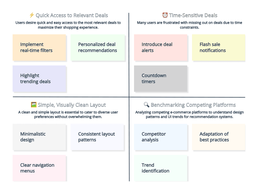 Home Page Recommendations: Deals tailored to user preferences and behavior. A carousel design was proposed for its easy scrollability and digestible presentation of time-sensitive deals.